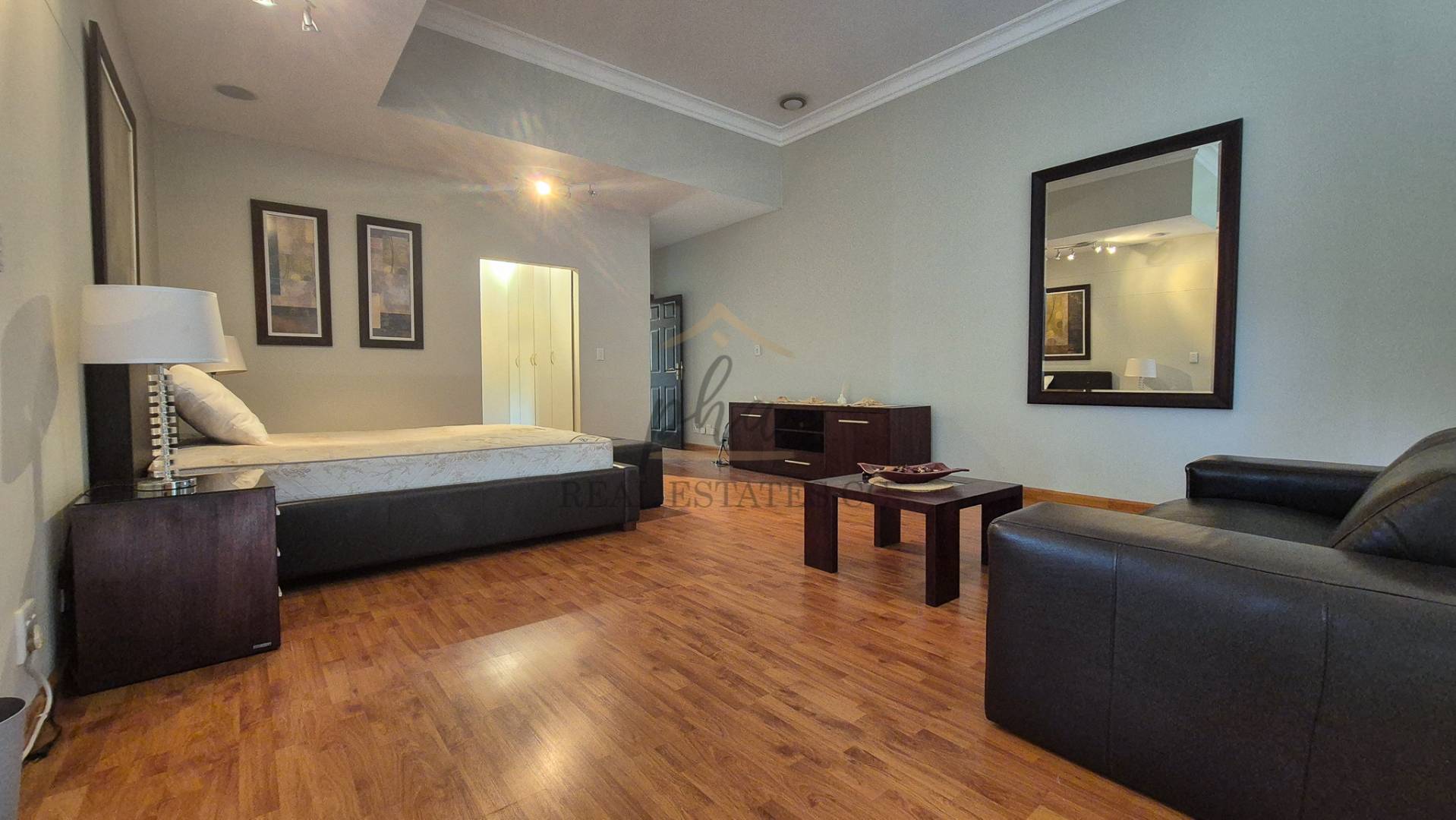 Eliminating the need for a traditional staircase, a hanging spiral staircase is illuminated by a skylight, leading to a pajama lounge with access to the main bedroom. The main bedroom boasts an ensuite bathroom and a spacious closet. Adjacent to this area is a gym or an additional bedroom, offering flexibility based on your requirements.