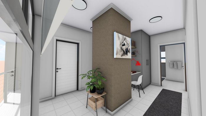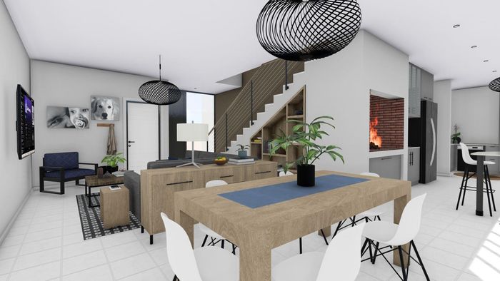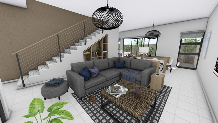 Open-plan living area with kitchen, dining, lounge area.