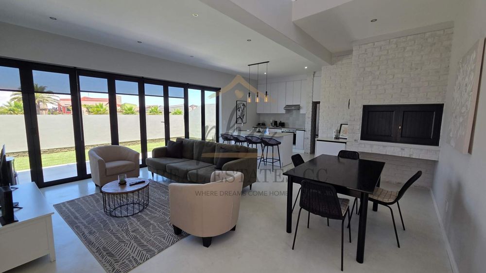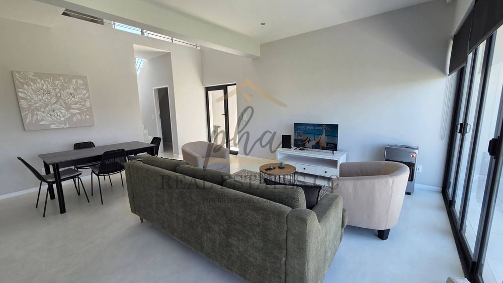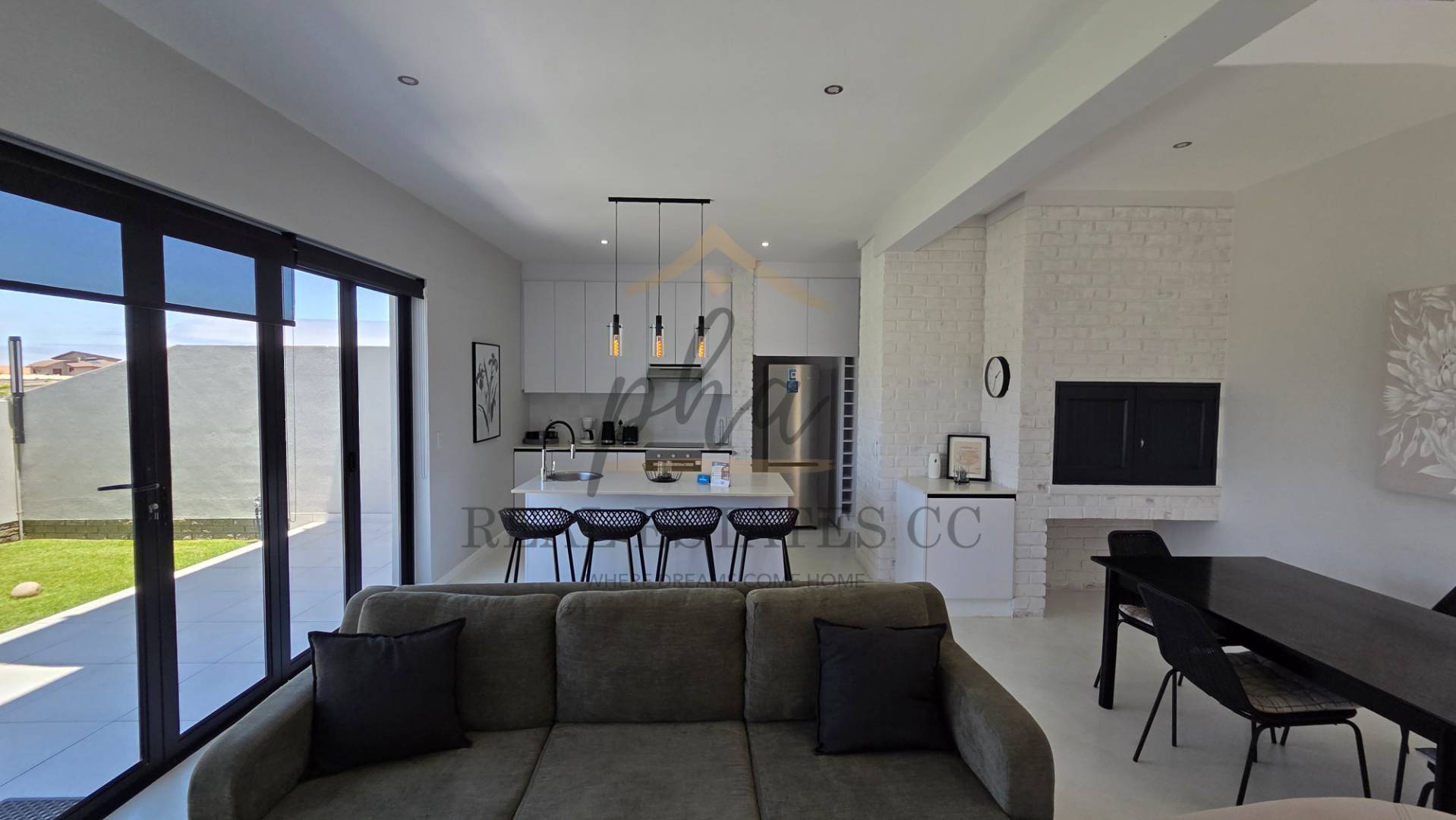 Open-plan living area with kitchen, dining, lounge area.