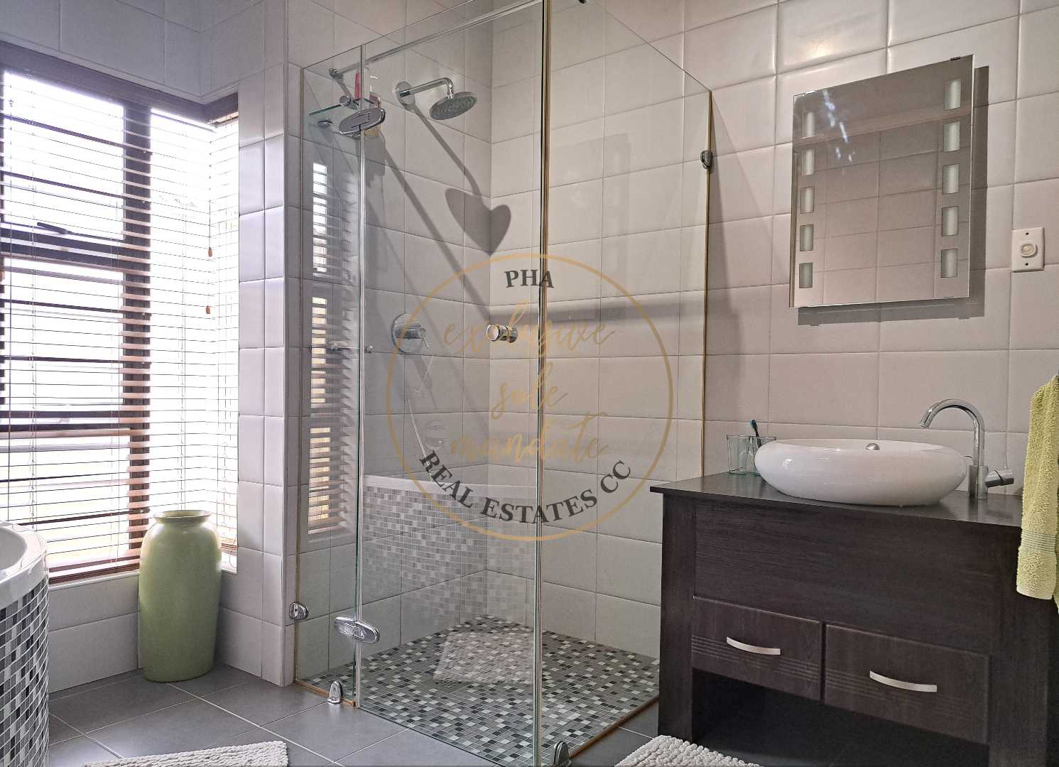 Heated towl rails, Double basins, spacious shower, fitted with 2 shower heads