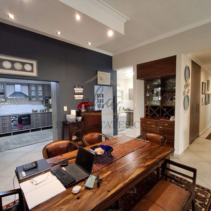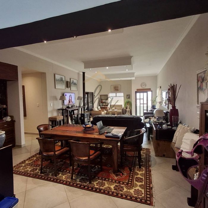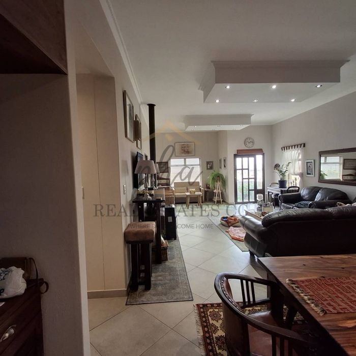 Open-Plan Living & Dining Area with striking exposed wood trusses