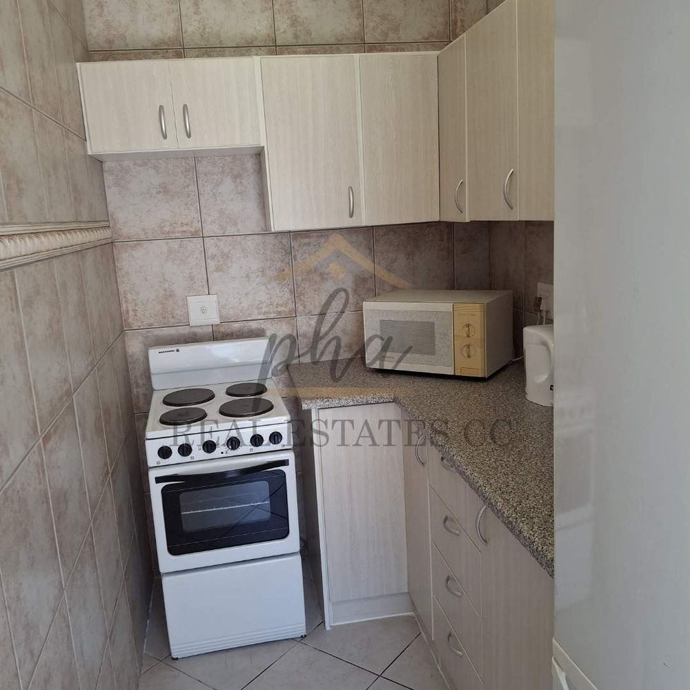 The flat offers a kitchenette, two bedrooms, and one bathroom, as well as a separate storage room.