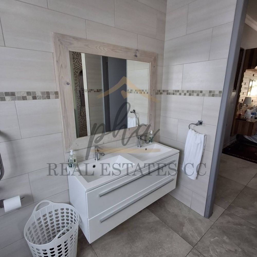 The main house offers spacious open-plan living areas, including a family/TV room, dining room, and an indoor braai room, flowing into a modern kitchen. There are a separate scullery and laundry, as well as a guest toilet on the ground floor.