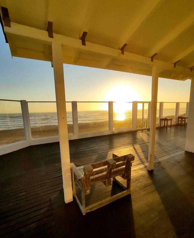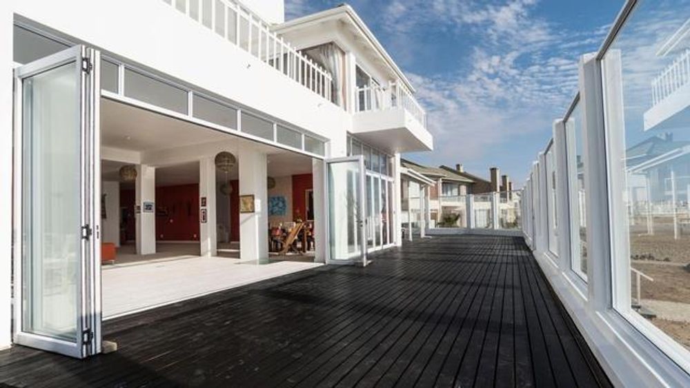 Large wooden terrace with retractable sliding doors create an indoor/outdoor living, situated directly above the beach and ocean, ideal for entertaining and lounging in the sun.
